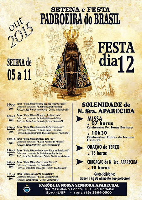 SETENA E FESTA DA PADROEIRA DO BRASIL. De 05 a 11 de Outubro sempre as 20hs, dia 12 programação especial o dia todo. Paroquia Nossa Senhora Aparecida Rua: Maximiano Lopes, 139 Jd. Denadai Sumaré SP. Fone: 19-3864-0500